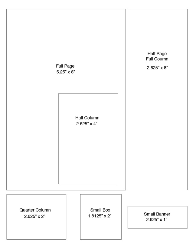 Half Page Full Column 2.625x8 - $225 Half Column 2.625x4 - $150